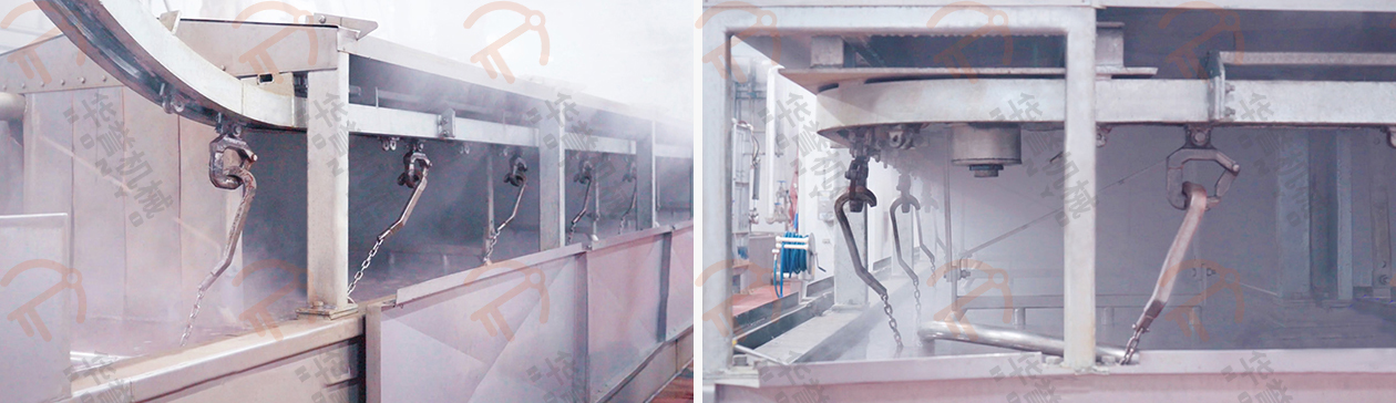 經(jīng)過(guò)打毛之后豬體,通過(guò)滑槽滑入清水池中由工人進(jìn)行清洗,清洗過(guò)后由人工轉(zhuǎn)掛的方式送入噴淋輸送間,噴淋過(guò)后再輸送到拍打清洗設(shè)備之中再次進(jìn)行沖洗。