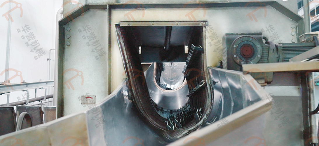 浸燙后的毛豬進(jìn)入螺旋打毛機(jī),該設(shè)備由兩臺(tái)組成,給進(jìn)入的毛豬進(jìn)行正反轉(zhuǎn)打毛,打毛率在98%以上。豬毛經(jīng)過(guò)下方的豬毛收集槽進(jìn)入豬毛處理間。