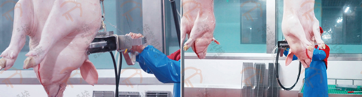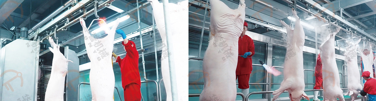 沖洗后的豬胴體由人工進(jìn)行表面燎毛、修刮處理,進(jìn)一步的去除豬胴體表面的細(xì)毛,確保最終產(chǎn)品的清潔度和美觀度。通過(guò)高溫處理,可以有效殺死表面的細(xì)菌,提高衛(wèi)生標(biāo)準(zhǔn)。