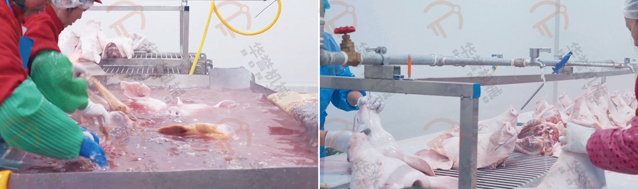 剪下豬頭運(yùn)送到專(zhuān)門(mén)的修刮清洗區(qū)域,由工人進(jìn)行細(xì)節(jié)上的處理。