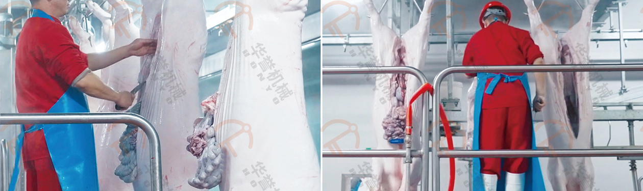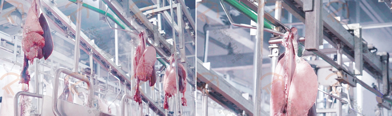 取下后的白臟放入白臟盤(pán)內(nèi),紅臟掛到紅臟鉤上,經(jīng)衛(wèi)生檢疫沒(méi)問(wèn)題后,通過(guò)輸送線送入紅白臟處理間。(白臟:胃、腸等部分;紅臟:心、肝、肺等紅色內(nèi)臟部分)