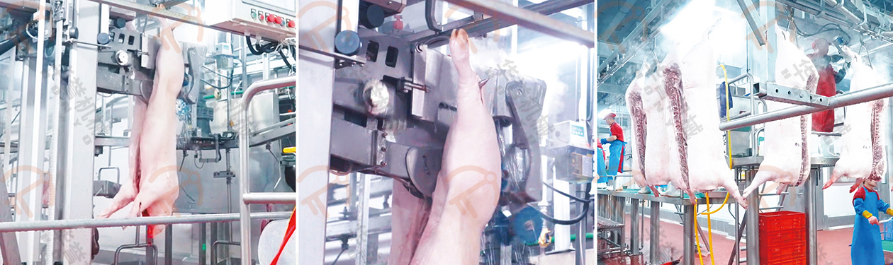 取完紅白臟的豬胴體由輸送線送入自動(dòng)劈半機(jī),該設(shè)備能精準(zhǔn)跟蹤定位并于輸送線保持同步,劈半后無(wú)肉末產(chǎn)生,胴體切口處無(wú)發(fā)黑現(xiàn)象,能大幅提高劈半處理效率。