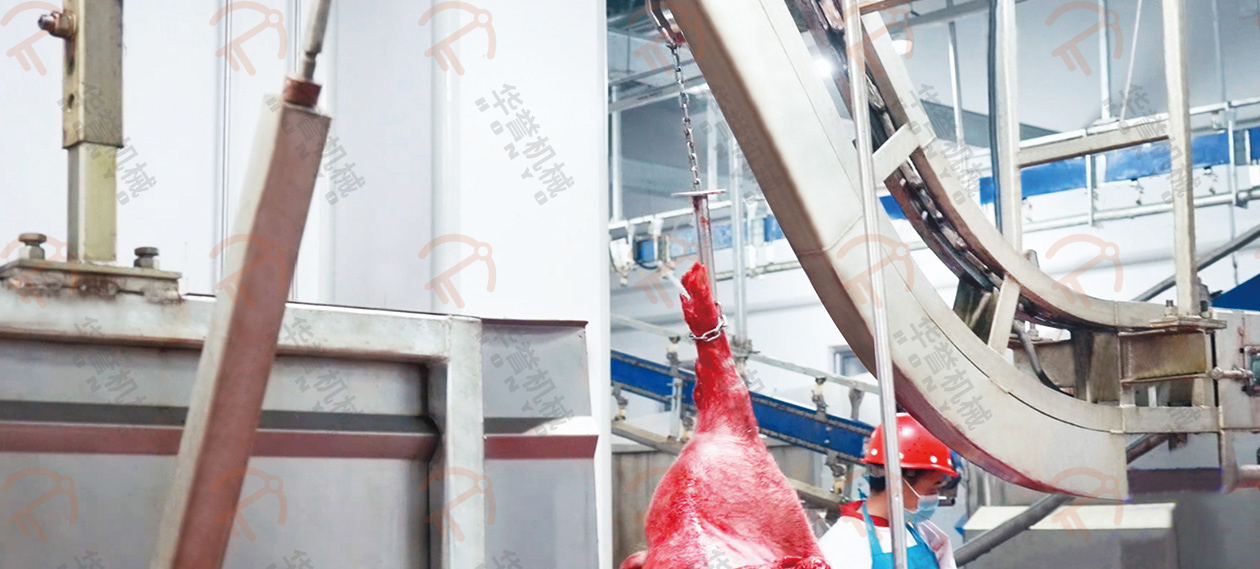 瀝血后的毛豬通過(guò)瀝血輸送線運(yùn)送到運(yùn)河式燙毛池前,通過(guò)下降機(jī)將毛豬浸在池內(nèi)進(jìn)行燙毛。運(yùn)河式燙毛池可實(shí)現(xiàn)人工或PLC遠(yuǎn)程控制操作,實(shí)現(xiàn)精準(zhǔn)控溫,更具有使用成本低、燙毛均勻、循環(huán)水方向與豬體輸送方向相反等優(yōu)勢(shì)。
